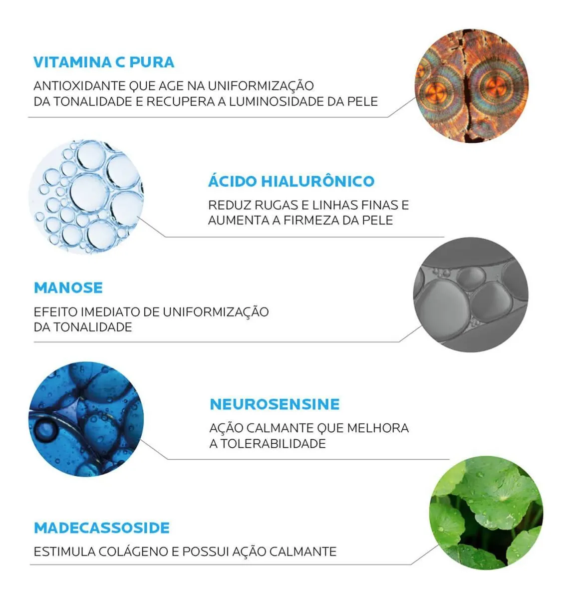 Sua fórmula combina Vitamina C Pura com Ácido Hialurônico fragmentado, Neurosensine e Manose, estimulando a produção de colágeno e fibras de sustentação, melhorando a elasticidade da pele e proporcionando firmeza e hidratação. Testado em peles sensíveis, este creme possui textura aveludada e não oleosa, deixando a pele suave e luminosa. Experimente o Pure Vitamin C Creme e veja os resultados visíveis em apenas 10 minutos após o primeiro uso!