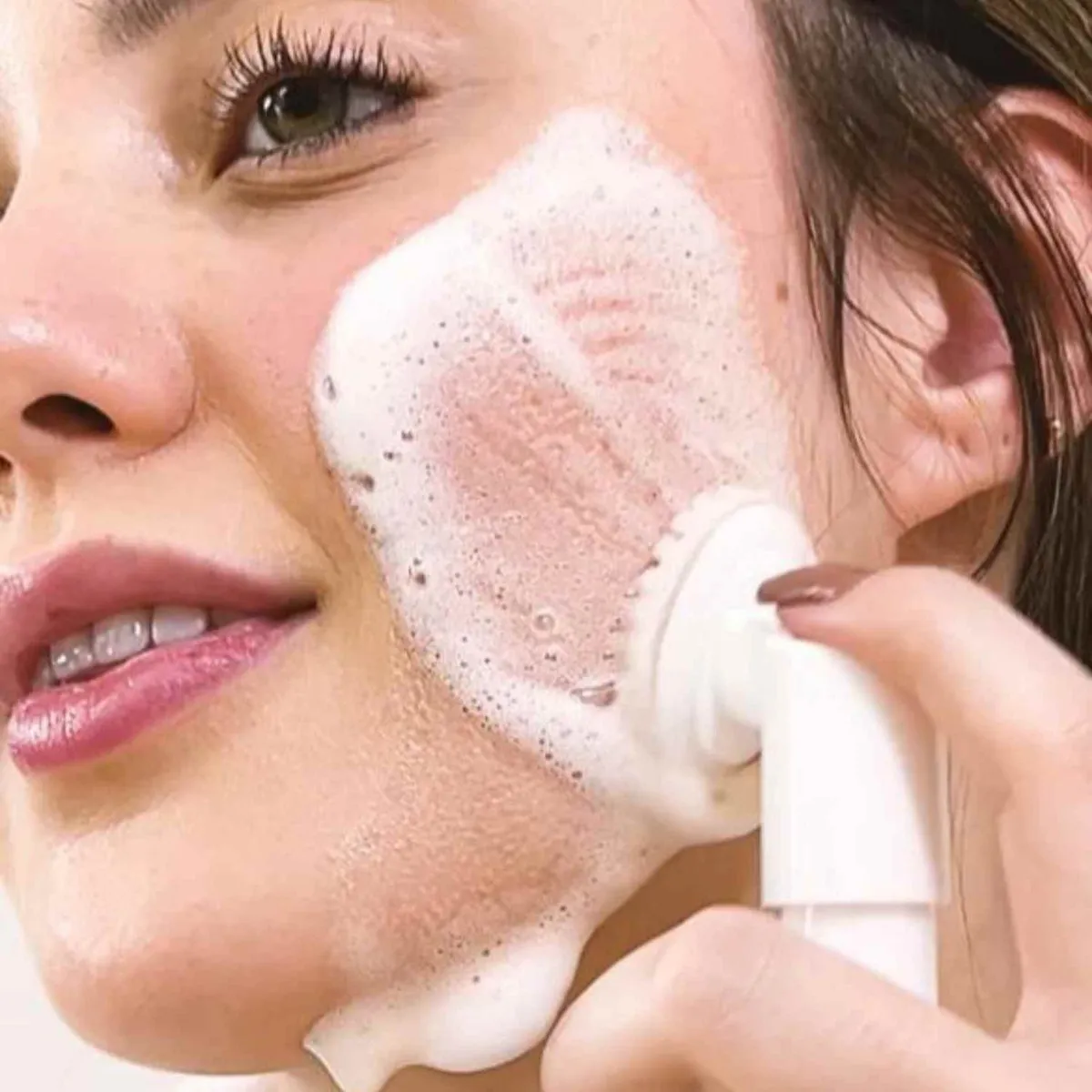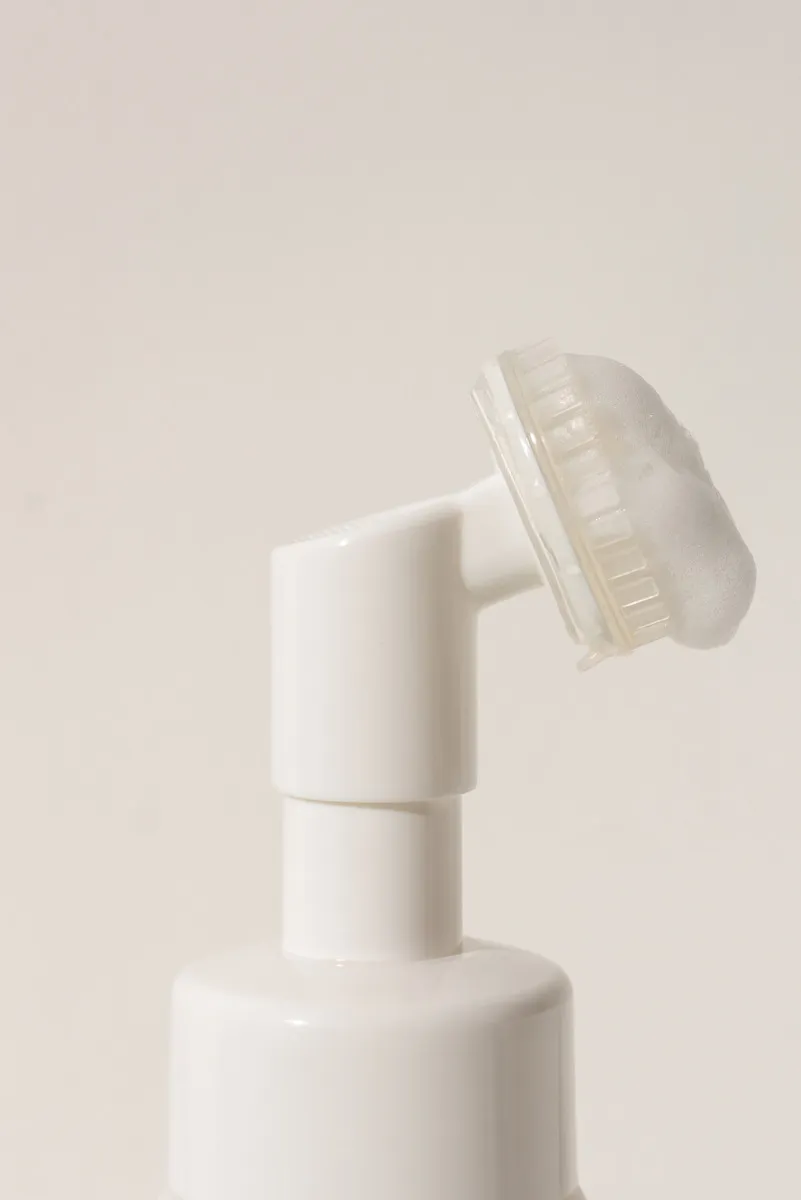 Frasco espumador com esponja de silicone acoplada que auxilia na limpeza e proporciona uma massagem delicada no rosto (sem esfoliar).