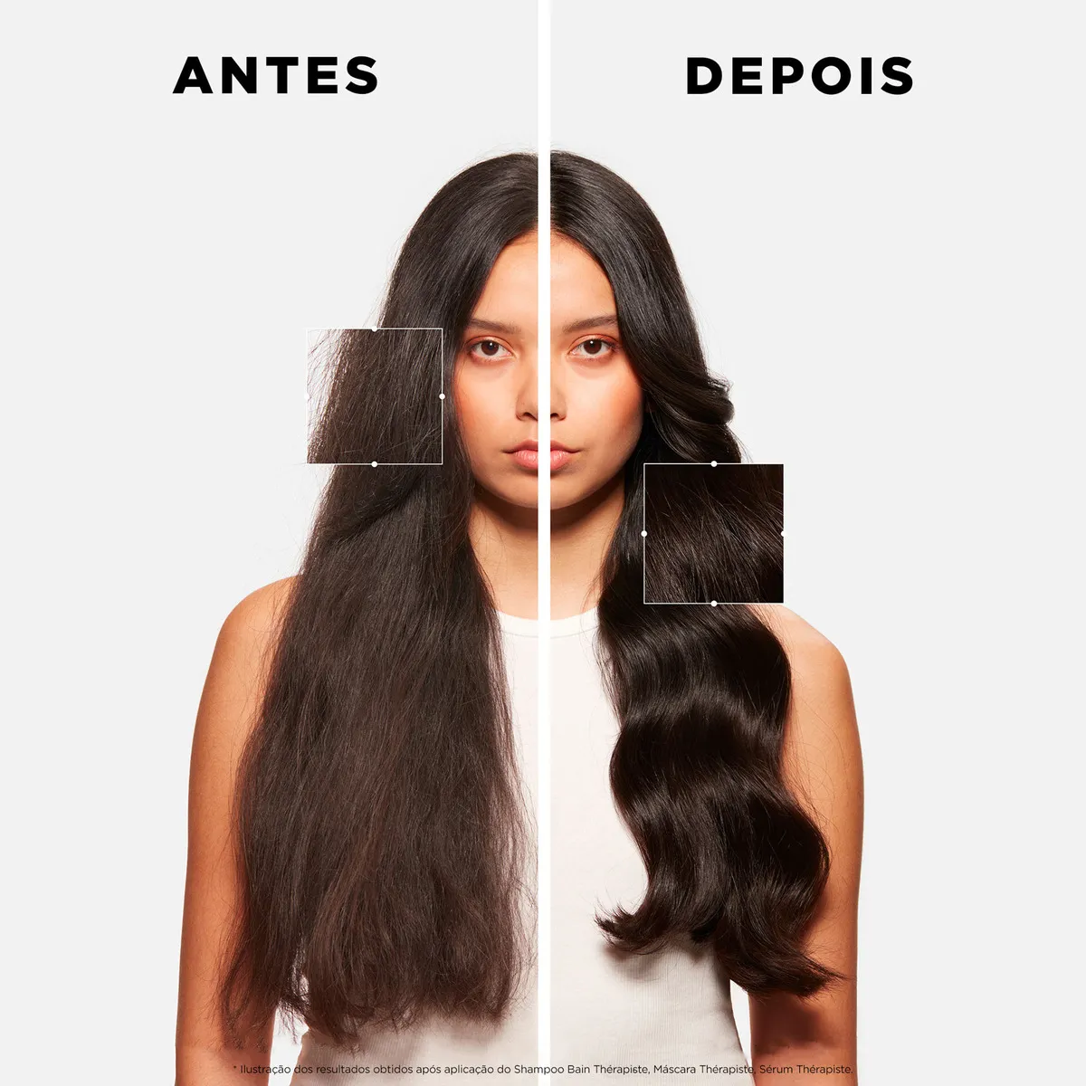 Sua fórmula contém o complexo Fibra-Karatine, que age profundamente na reconstrução da estrutura interna dos fios, reparando danos causados por processos químicos, como colorações, alisamentos e outras agressões externas. O Bain Thérapiste também é enriquecido com proteínas e ceramidas, que ajudam a restaurar a elasticidade e a suavidade dos cabelos, tornando-os visivelmente mais macios e brilhosos.